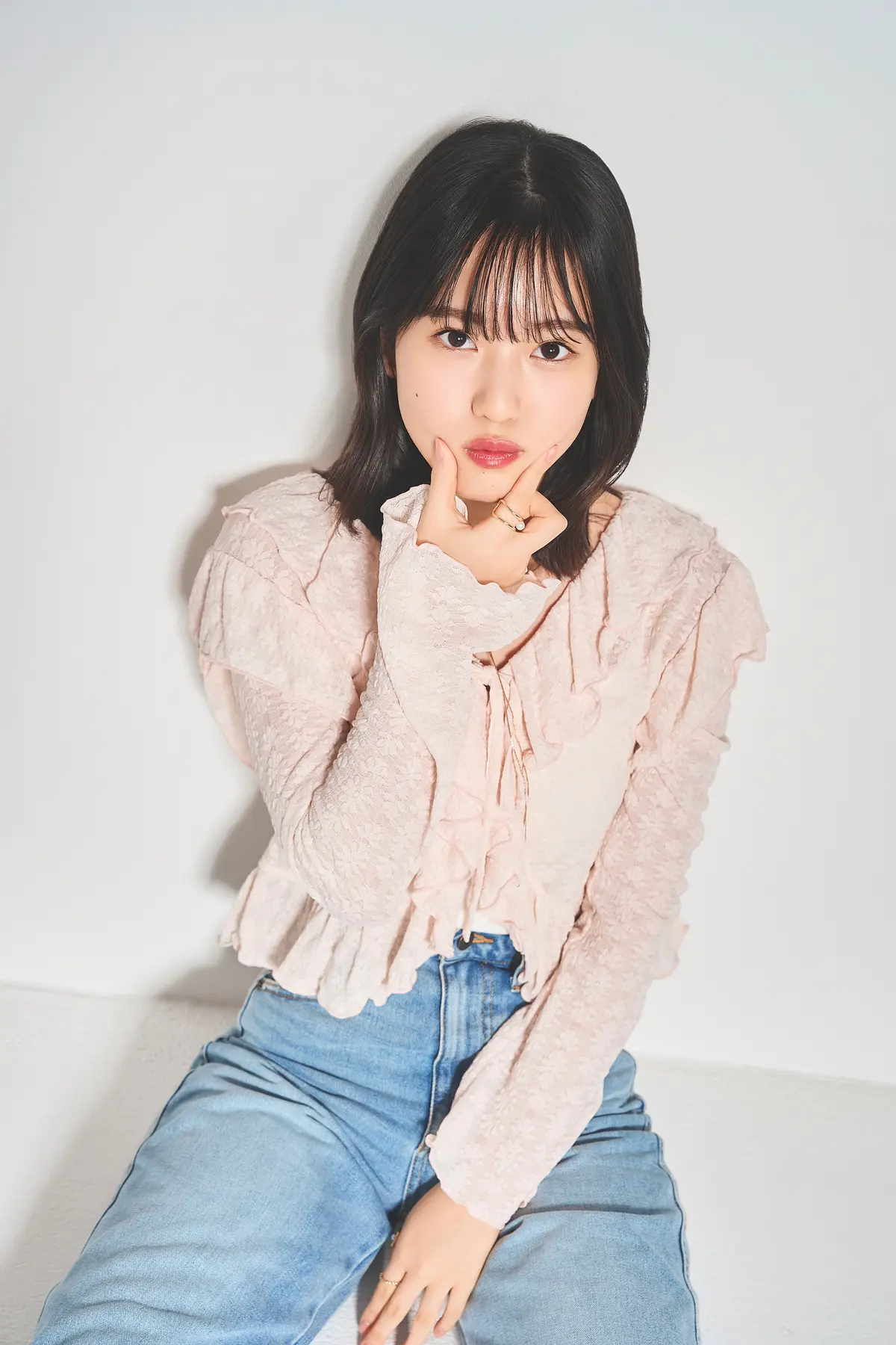 ピンクレースカーディガン¥3299/PHILLY デニムパンツ¥3299/WEGO イヤカフ¥330、スクエアリング¥990、その他ゴールドリング各¥330/ルナアース ブーツ、インナー、ネックレス/スタイリスト私物