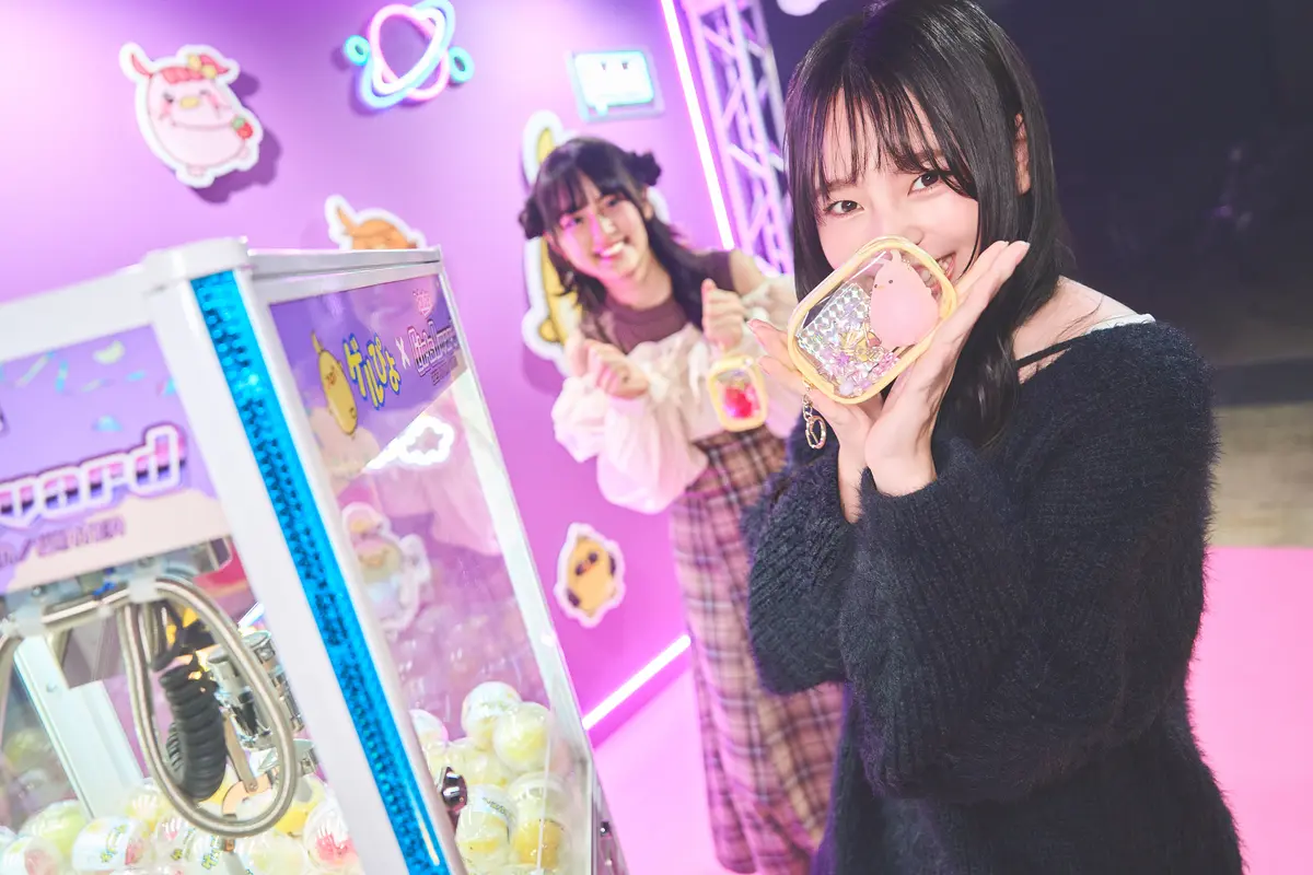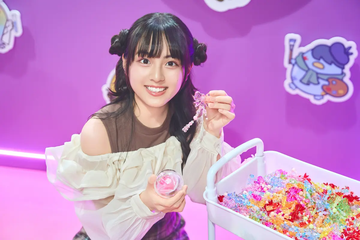 カプセルトイにつけるチャームを選ばせてもらったよ。優名は「濃いピンクトイ×薄ピンクチャーム」、舞羽は「薄ピンクトイ×紫チャーム」にして、自分らしいチャームに。優名はすぐさま自分のバッグにつけてたよ! スクバにつけてゲルぴよちゃんと一緒に登下校するのも絶対かわいい♡